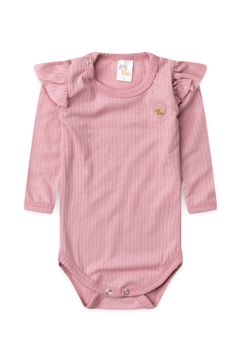 o body de manga longa possui babados sutis nos ombros, trazendo um toque romântico e encantador, além de um delicado patch frontal em formato de coração que transmite carinho e cuidado nos detalhes.